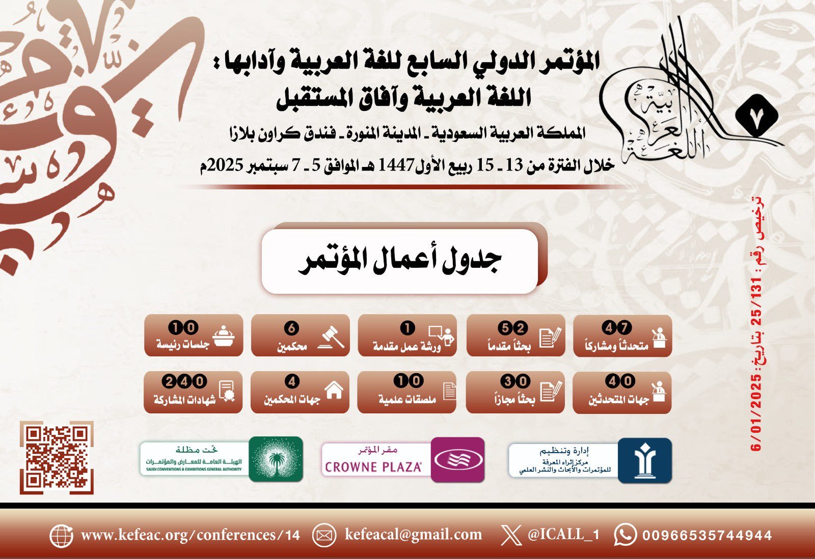 تنطلق في المدينة المنورة، يوم السبت المقبل، أعمال المؤتمر الدولي السابع للغة العربية وآدابها، تحت شعار “اللغة العربية وآفاق المستقبل”، وذلك في فندق كراون بلازا المدينة، وتستمر فعالياته يومين، تحت مظلة الهيئة العامة للمعارض والمؤتمرات.